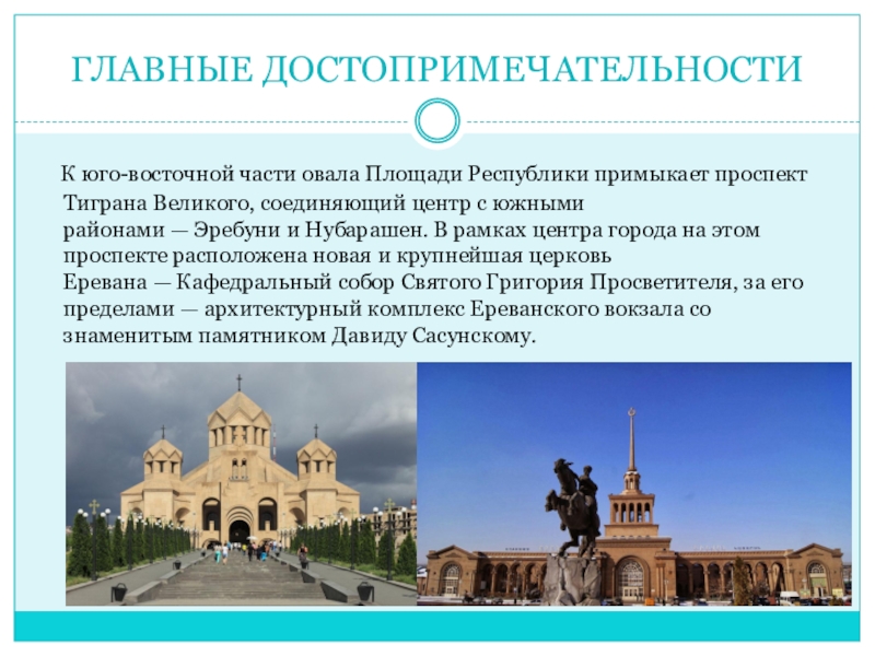 Великого, соединяющий центр с южными районами — Эребуни и Нубарашен. В рамках центра города на этом проспекте расположена новая и крупнейшая церковь Еревана — Кафедральный собор Святого Григория Просветителя, за его пределами — архитектурный комплекс Ереванского вокзала со знаменитым памятником Давиду Сасунскому.