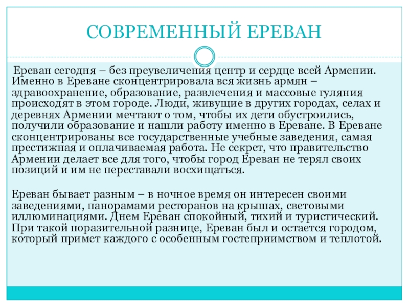 сердце всей Армении. Именно в Ереване сконцентрировала вся жизнь армян – здравоохранение, образование, развлечения и массовые гуляния происходят в этом городе. Люди, живущие в других городах, селах и деревнях Армении мечтают о том, чтобы их дети обустроились, получили образование и нашли работу именно в Ереване. В Ереване сконцентрированы все государственные учебные заведения, самая престижная и оплачиваемая работа. Не секрет, что правительство Армении делает все для того, чтобы город Ереван не терял своих позиций и им не переставали восхищаться.
