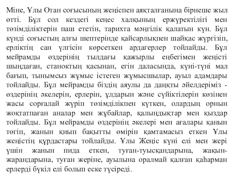 кездегі кеңес халқының ержүректілігі мен төзімділіктерін паш ететін, тарихта мәңгілік қалатын күн. Бұл күнді соғыстың алғы шептерінде қайсарлықпен шайқас жүргізіп, ерліктің сан үлгісін көрсеткен ардагерлер тойлайды. Бұл мейрамды өздерінің тылдағы қажырлы еңбегімен жеңісті шыңдаған, станоктың қасынан, егін даласында, күні-түні мал бағып, тынымсыз жұмыс істеген жұмысшылар, ауыл адамдары тойлайды. Бұл мейрамды біздің аяулы да даңқты әйелдеріміз - өздерінің әкелерін, ерлерін, ұлдарын және сүйіктілерін көзінен жасы сорғалай жүріп төзімділікпен күткен, олардың орнын жоқтатпаған аналар мен жұбайлар, қалыңдықтар мен қыздар тойлайды. Бұл мейрамды өздерінің әкелері мен ағалары қанын төгіп, жанын қиып бақытты өмірін қамтамасыз еткен Ұлы жеңістің құрдастары тойлайды. Ұлы Жеңіс күні елі мен жері үшін жанын пида еткен, туған-туысқандарына, жақын-жарандарына, туған жеріне, ауылына оралмай қалған қаһарман ерлерді бүкіл елі болып еске түсіреді.