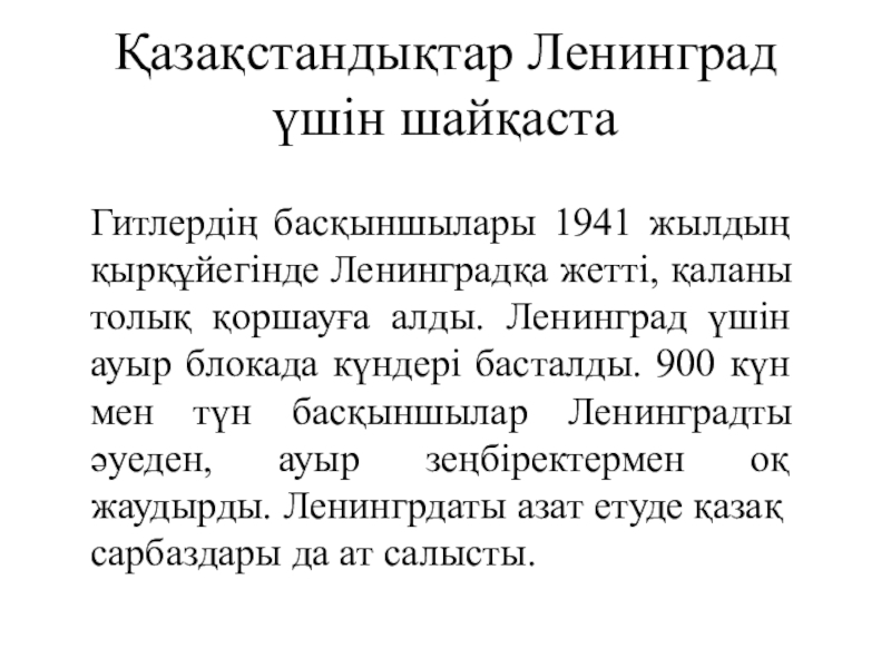 толық қоршауға алды. Ленинград үшін ауыр блокада күндері басталды. 900 күн мен түн басқыншылар Ленинградты әуеден, ауыр зеңбіректермен оқ жаудырды. Ленингрдаты азат етуде қазақ сарбаздары да ат салысты.