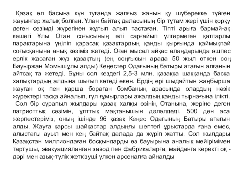 Сол бір сұрапыл жылдары қазақ халқы өзінің Отанына, жеріне деген патриоттық сезімін, ұлттық мақтанышын дәлелдеді. 500 ден аса жерлестеріміз, оның ішінде 96 қазақ Кеңес Одағының Батыры атағын алды. Жауға қарсы шайқастар алдыңғы шептегі ұрыстарда ғана емес, алыстағы ауыл мен кең байтақ далада да жүріп жатты. Сол жылдары Қазақстан миллиондаған босқындарды өз бауырына аналық мейірімімен тартушы, эвакуацияланған завод пен фабрикаларға, майданға керекті оқ -дәрі мен азық-түлік жеткізуші үлкен арсеналға айналды