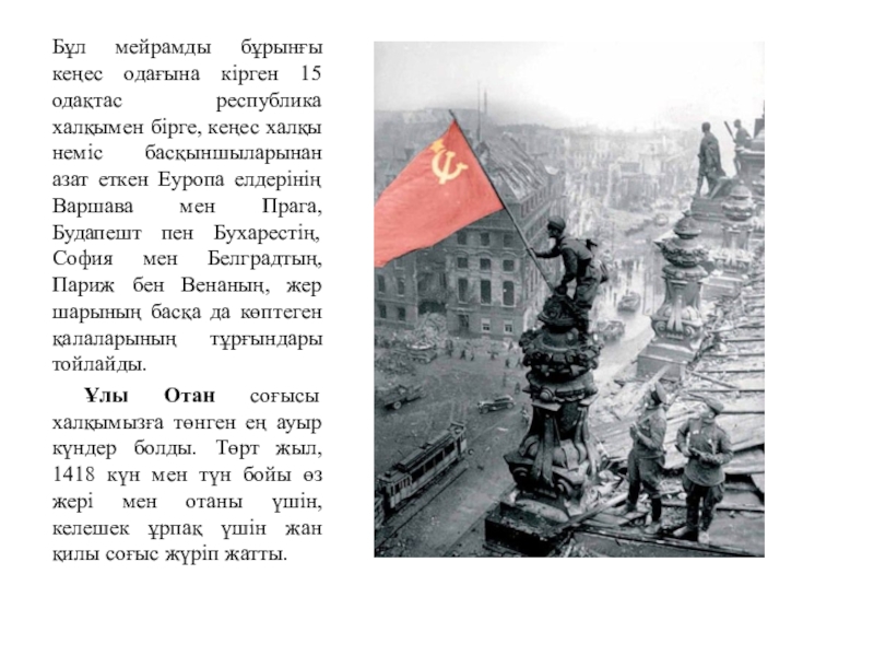 Слайд 18 Сол кездегі Кеңес Одағының басқа халқымен бірге жауды талқандап,