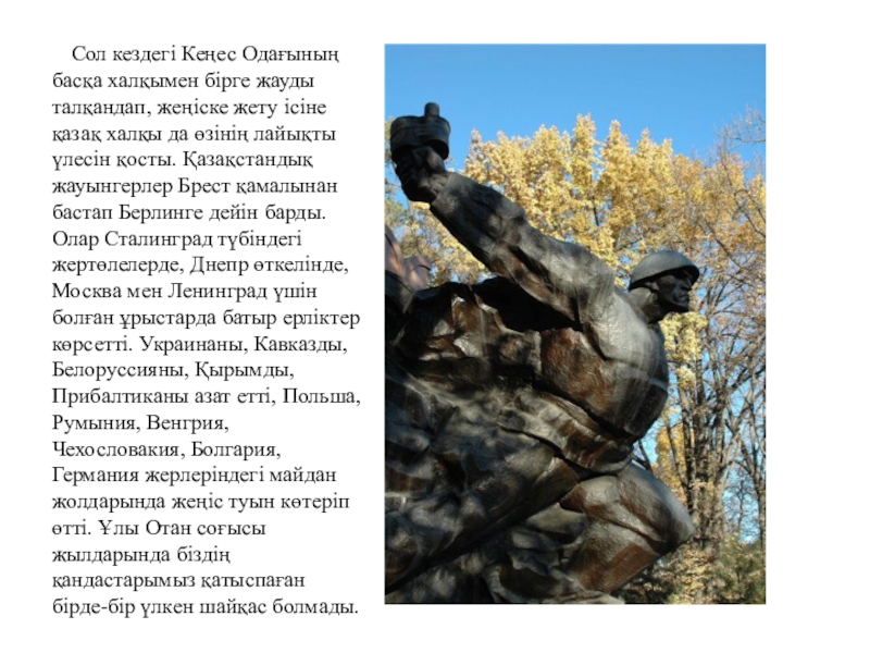 жеңіске жету ісіне қазақ халқы да өзінің лайықты үлесін қосты. Қазақстандық жауынгерлер Брест қамалынан бастап Берлинге дейін барды. Олар Сталинград түбіндегі жертөлелерде, Днепр өткелінде, Москва мен Ленинград үшін болған ұрыстарда батыр ерліктер көрсетті. Украинаны, Кавказды, Белоруссияны, Қырымды, Прибалтиканы азат етті, Польша, Румыния, Венгрия, Чехословакия, Болгария, Германия жерлеріндегі майдан жолдарында жеңіс туын көтеріп өтті. Ұлы Отан соғысы жылдарында біздің қандастарымыз қатыспаған бірде-бір үлкен шайқас болмады.