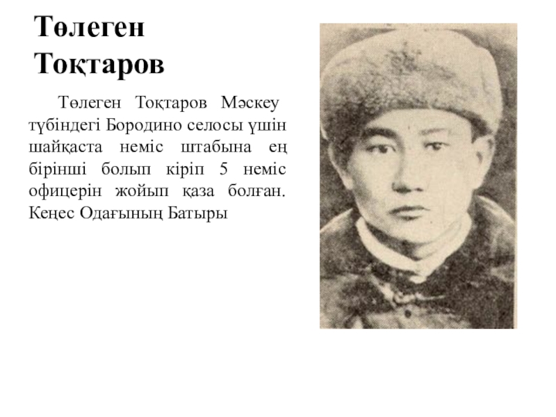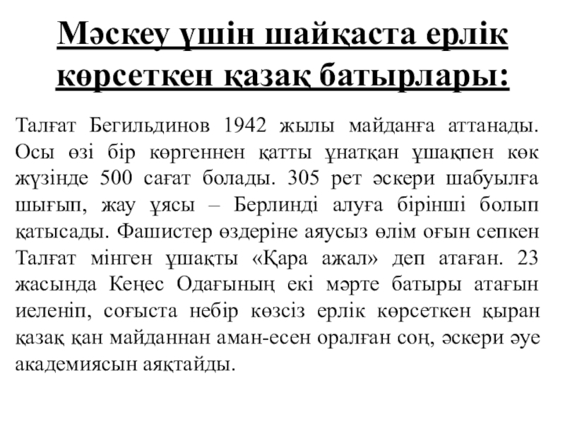 Слайд 14Мәскеу үшін шайқаста ерлік көрсеткен қазақ батырлары:
