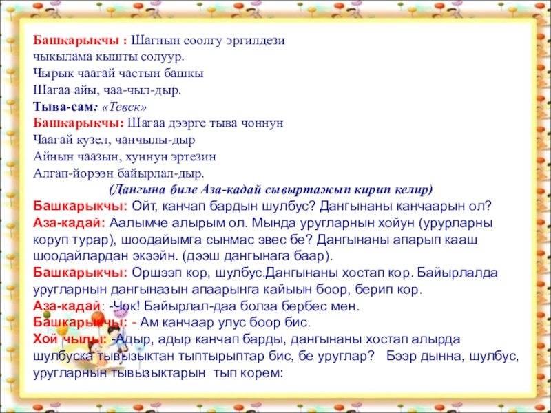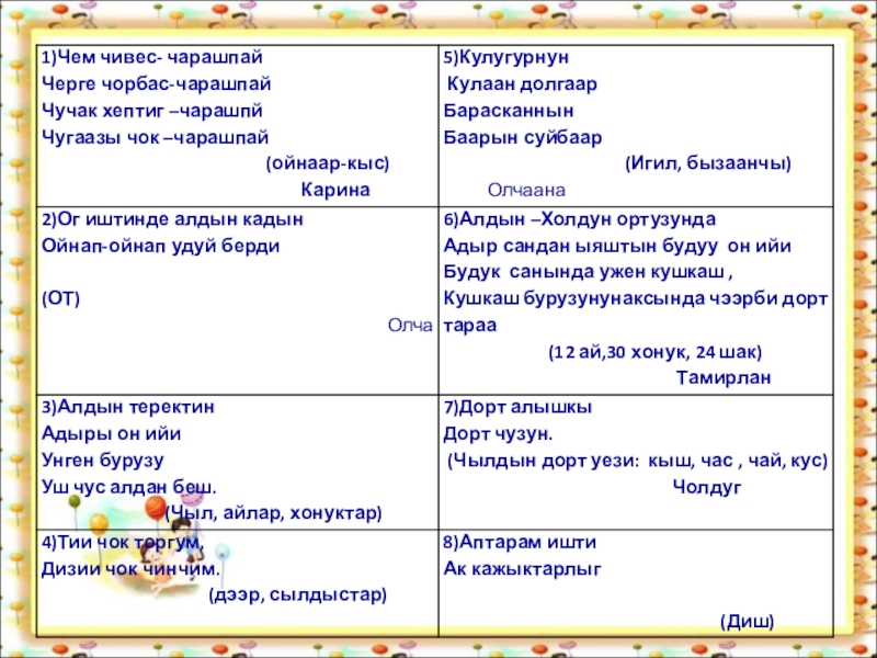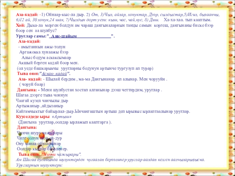 Аза-кадай: -1) Ойнаар-кыс-ла дыр. 2) От, 3)Чыл, айлар, хонуктар, Дээр, сылдыстар,5)Игил, бызаанчы, 6)12 ай, 30 хонук,24 шак, 7)Чылдын дорт уези: кыш, час, чай,кус, 8) Диш. Ха-ха-хаа. тып кааптым. Хой: Дыка-ла мерген болдун ам чараш дангыналарнын танцы самын коргеш, дангынаны биске бээр боор сен аа шулбус?