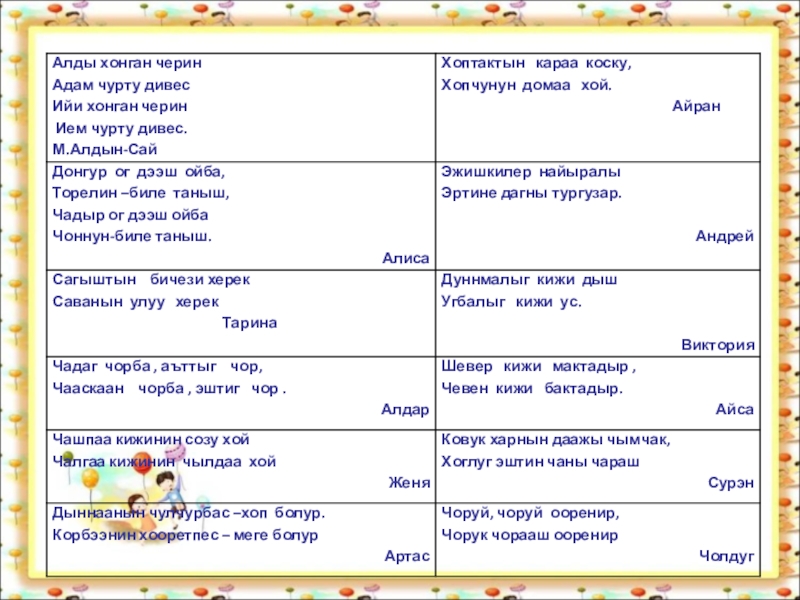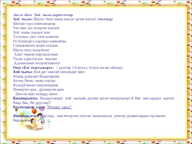 Аза- кадай: - Шылай бердим , ма-ма Дангынанар ап алынар. Мен чорууйн .