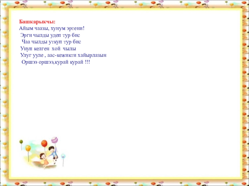 Кайгамчыктыг байырлал-дыр.Ынчангаштын артыш деп ырывыс ырлаптаалынар уруглар.
