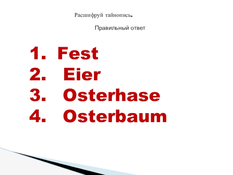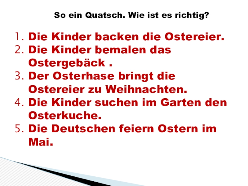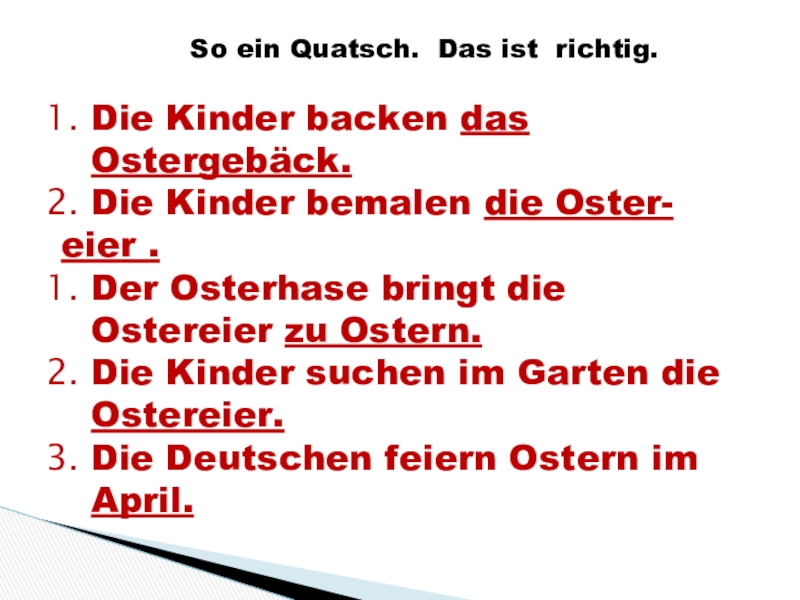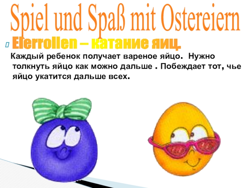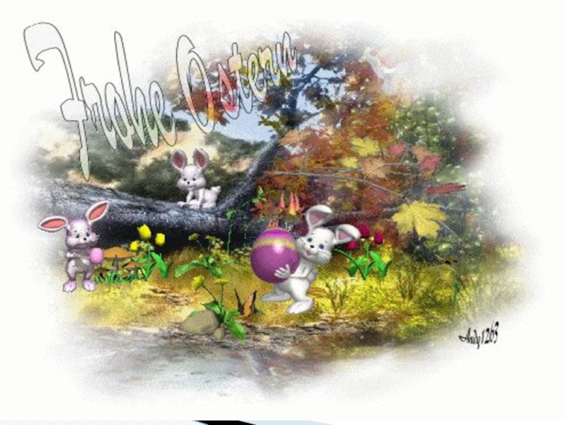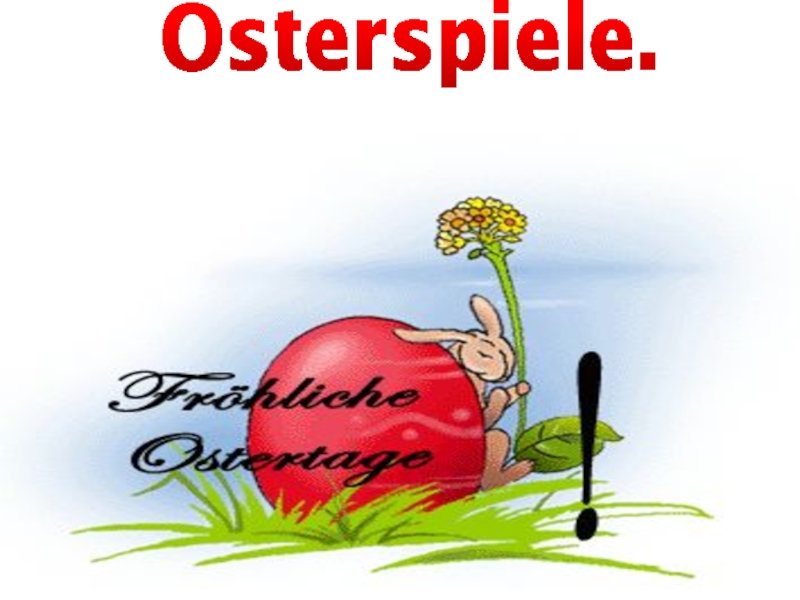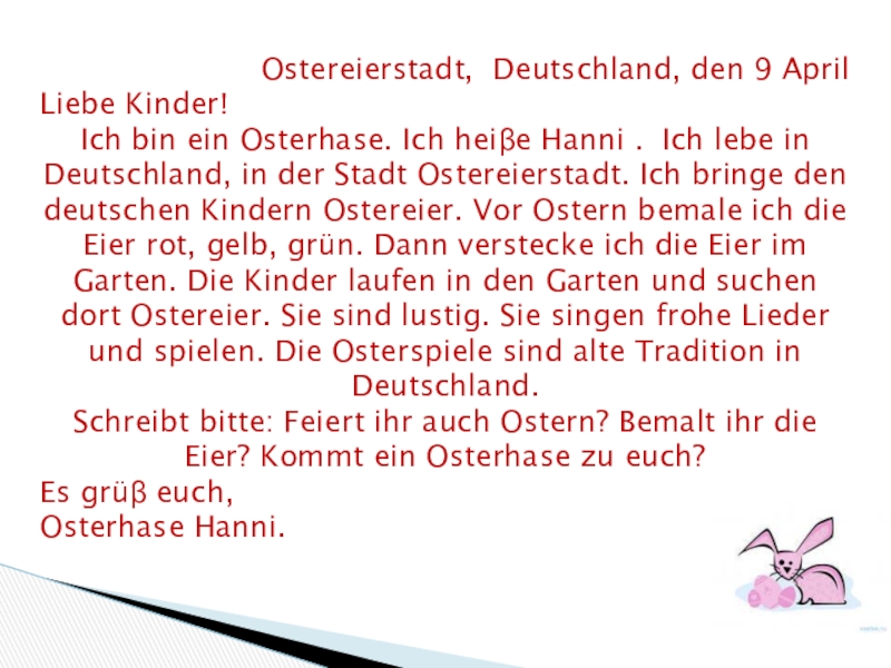 Ich bin ein Osterhase. Ich heiβe Hanni . Ich lebe in Deutschland, in der Stadt Ostereierstadt. Ich bringe den deutschen Kindern Ostereier. Vor Ostern bemale ich die Eier rot, gelb, grün. Dann verstecke ich die Eier im Garten. Die Kinder laufen in den Garten und suchen dort Ostereier. Sie sind lustig. Sie singen frohe Lieder und spielen. Die Osterspiele sind alte Tradition in Deutschland.