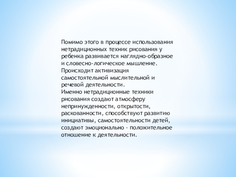 Слайд 11Помимо этого в процессе использования нетрадиционных техник рисования у ребенка развивается