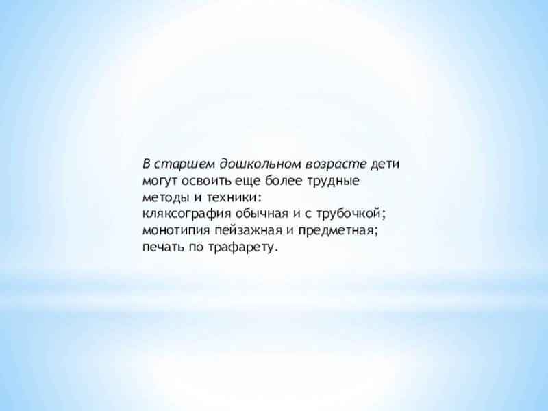 В старшем дошкольном возрасте дети могут освоить еще более трудные методы и техники:кляксография обычная и с трубочкой;монотипия пейзажная