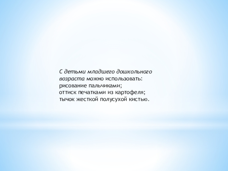 С детьми младшего дошкольного возраста можно использовать:рисование пальчиками;оттиск печатками из картофеля;тычок жесткой полусухой кистью.