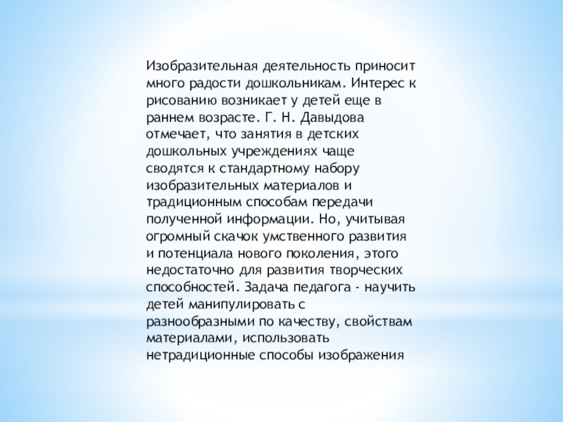 детей еще в раннем возрасте. Г. Н. Давыдова отмечает, что занятия в детских дошкольных учреждениях чаще сводятся к стандартному набору изобразительных материалов и традиционным способам передачи полученной информации. Но, учитывая огромный скачок умственного развития и потенциала нового поколения, этого недостаточно для развития творческих способностей. Задача педагога - научить детей манипулировать с разнообразными по качеству, свойствам материалами, использовать нетрадиционные способы изображения