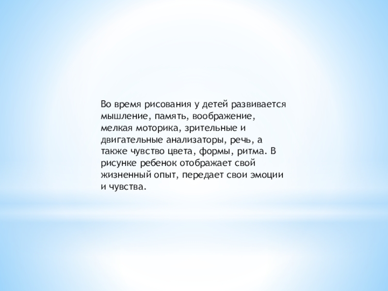 Во время рисования у детей развивается мышление, память, воображение, мелкая моторика, зрительные и двигательные анализаторы, речь, а также чувство цвета, формы, ритма. В рисунке ребенок отображает свой жизненный опыт, передает свои эмоции и чувства.