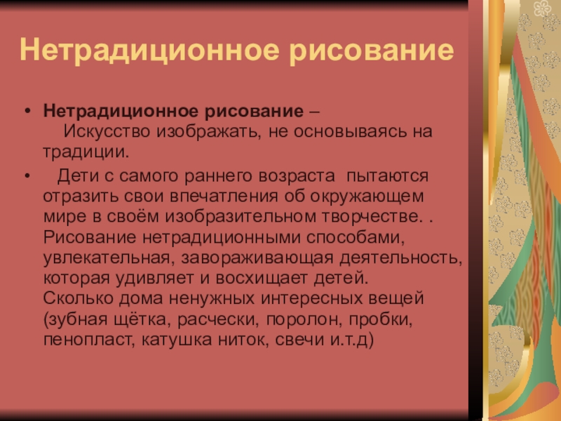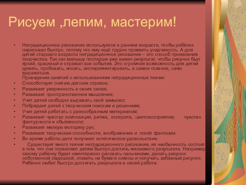 Рисование – большая и серьезная работа для ребенка. Даже каракули содержат для маленького художника вполне конкретную информацию и смысл. Определенное достоинство рисования по сравнению с другими видами деятельности в том, что этот вид творчества требует согласованного участия многих психических функций.