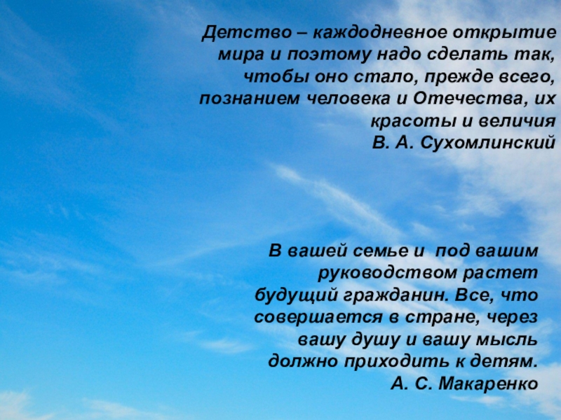 В вашей семье и под вашим руководством растет будущий гражданин. Все, что совершается в стране, через вашу душу и вашу мысль должно приходить к детям. А. С. Макаренко
