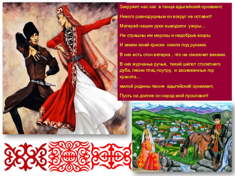 Закружит нас как в танце адыгейский орнамент.Никого равнодушным он вокруг не оставит!Матерей наших руки выводили узоры…Не страшны
