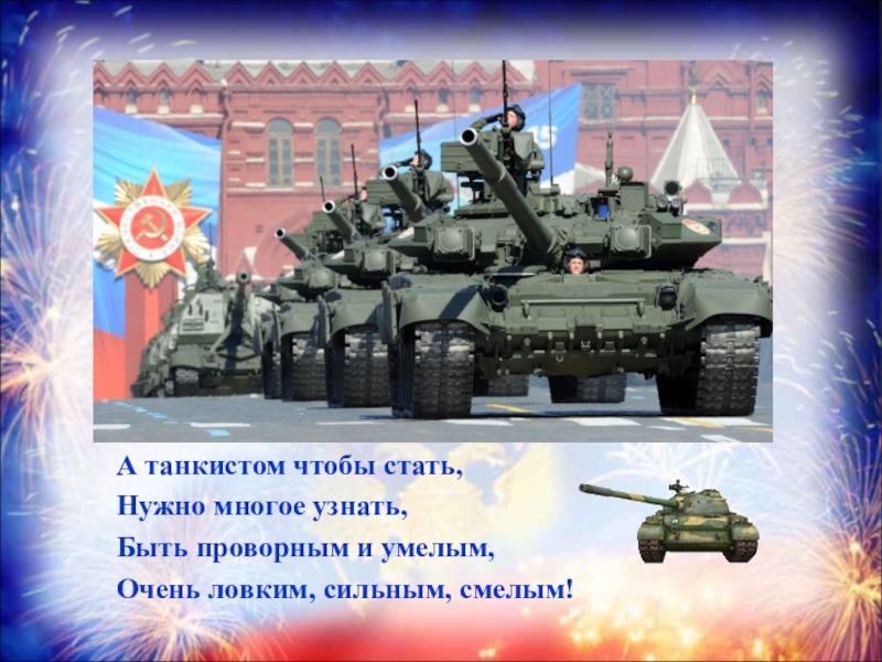А танкистом чтобы стать,Нужно многое узнать,Быть проворным и умелым,Очень ловким, сильным, смелым!