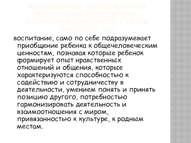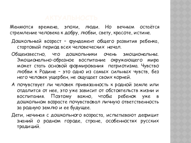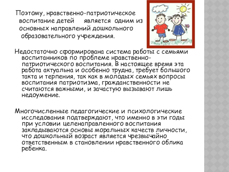 Многочисленные педагогические и психологические исследования подтверждают, что именно в эти годы при условии целенаправленного воспитания закладываются основы моральных качеств личности, что дошкольный возраст является чрезвычайно ответственным в становлении нравственного облика ребенка.