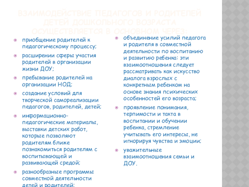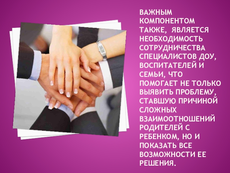 объединение усилий педагога и родителя в совместной деятельности по воспитанию и развитию ребенка: эти взаимоотношения следует рассматривать как искусство диалога взрослых с конкретным ребенком на основе знания психических особенностей его возраста;