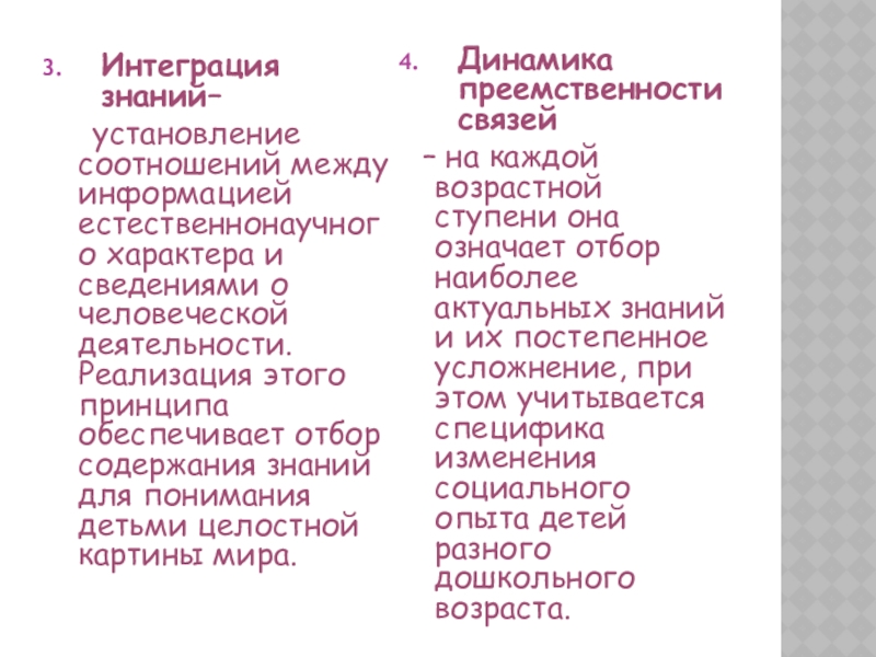 – на каждой возрастной ступени она означает отбор наиболее актуальных знаний и их постепенное усложнение, при этом учитывается специфика изменения социального опыта детей разного дошкольного возраста.