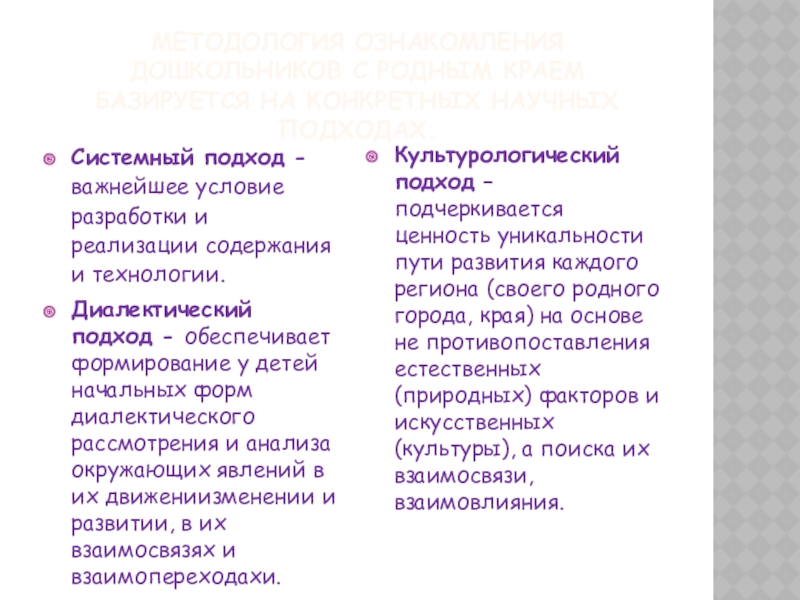 Культурологический подход – подчеркивается ценность уникальности пути развития каждого региона (своего родного города, края) на основе не противопоставления естественных (природных) факторов и искусственных (культуры), а поиска их взаимосвязи, взаимовлияния.