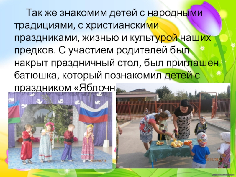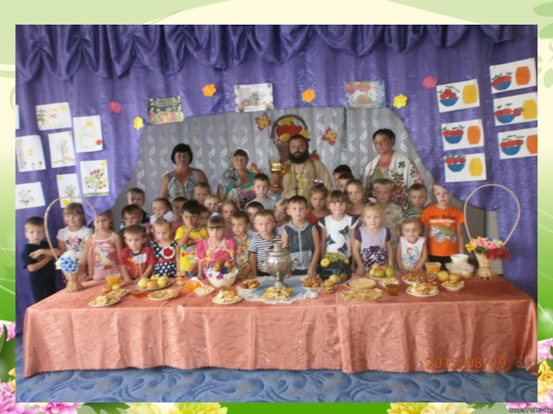 христианскими праздниками, жизнью и культурой наших предков. С участием родителей был накрыт праздничный стол, был приглашен батюшка, который познакомил детей с праздником «Яблочный спас».