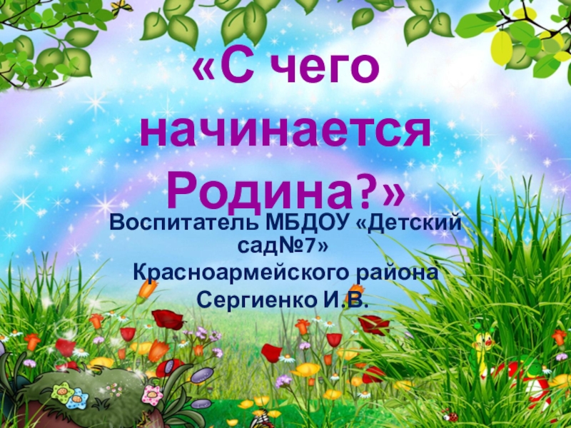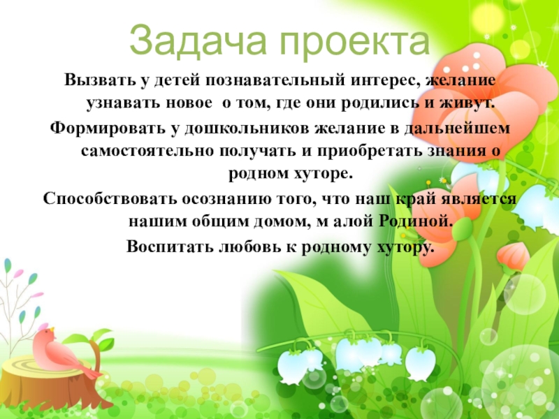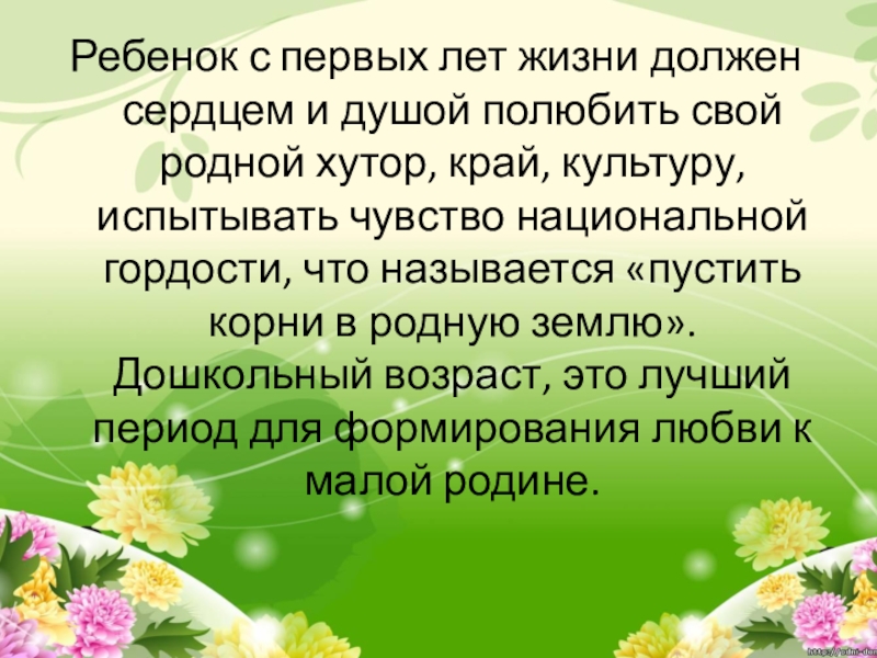 родной хутор, край, культуру, испытывать чувство национальной гордости, что называется «пустить корни в родную землю». Дошкольный возраст, это лучший период для формирования любви к малой родине.