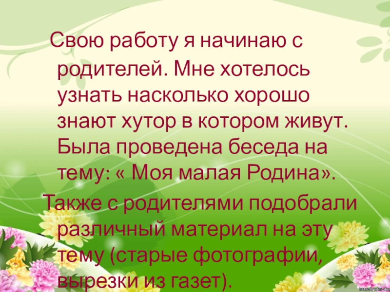 Слайд 7 Свою работу я начинаю с родителей. Мне хотелось узнать насколько