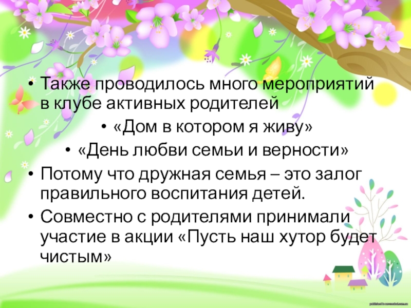 Слайд 9Также проводилось много мероприятий в клубе активных родителей