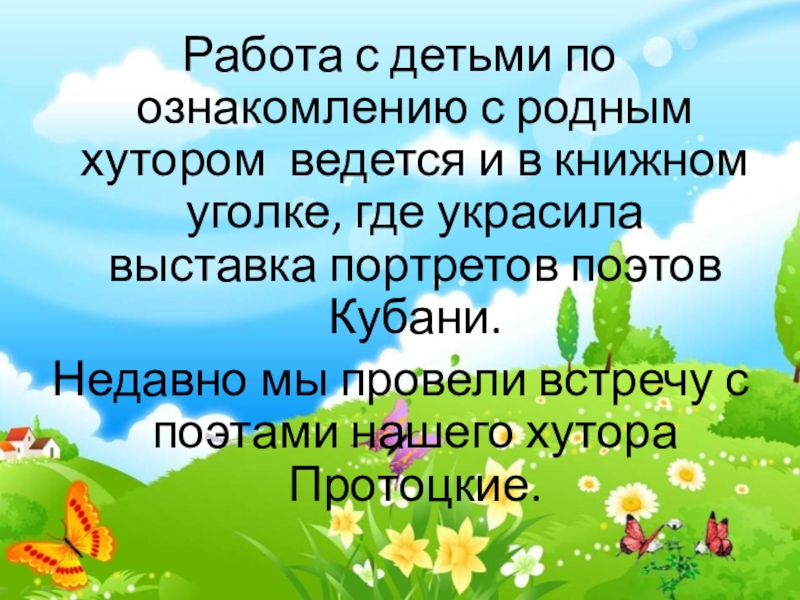 Слайд 13Работа с детьми по ознакомлению с родным хутором ведется и в