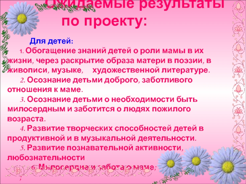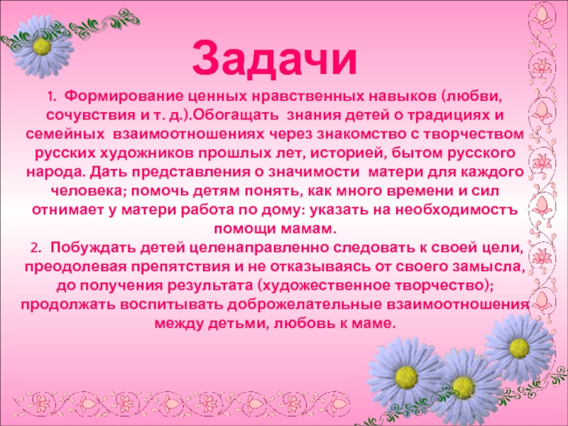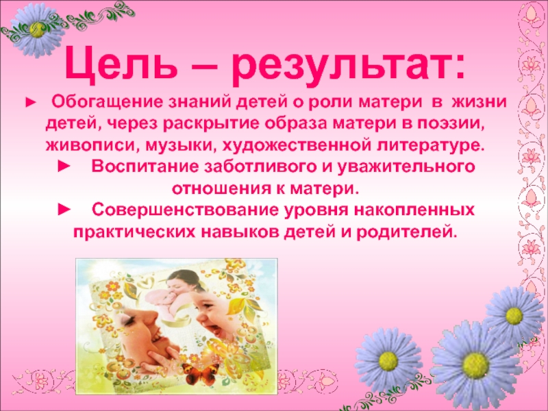 1. Обогащение знаний детей о роли мамы в их жизни, через раскрытие образа матери в поэзии, в живописи, музыке, художественной литературе.