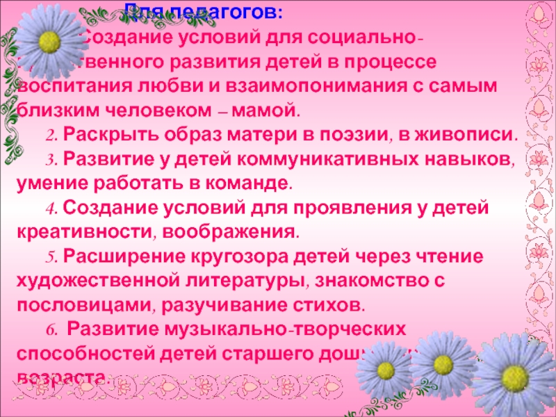 1. Создание условий для социально-нравственного развития детей в процессе воспитания любви и взаимопонимания с самым близким человеком – мамой.