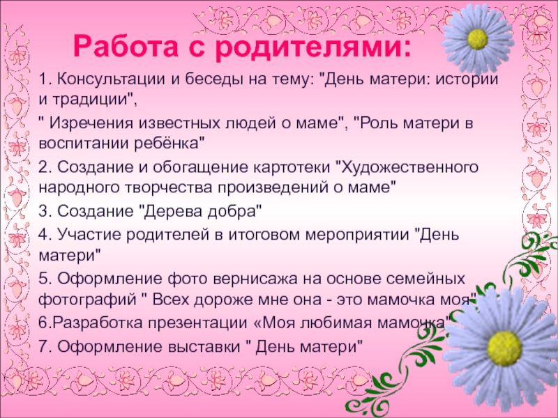 ► Обогащение знаний детей о роли матери в
