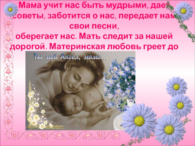 Слайд 20Мама учит нас быть мудрыми, дает советы, заботится о нас, передает