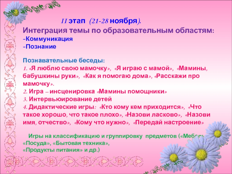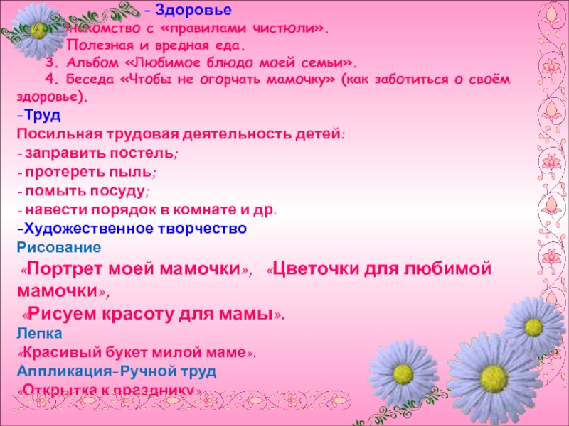 1. «Я люблю свою мамочку», «Я играю с мамой», «Мамины, бабушкины руки», «Как я помогаю дома», «Расскажи про мамочку».