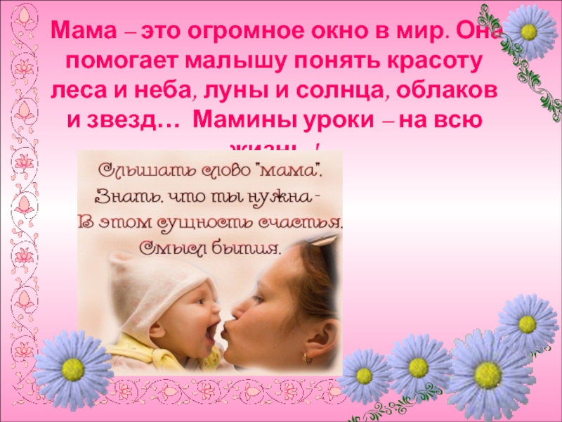 Слайд 21Мама – это огромное окно в мир. Она помогает малышу понять