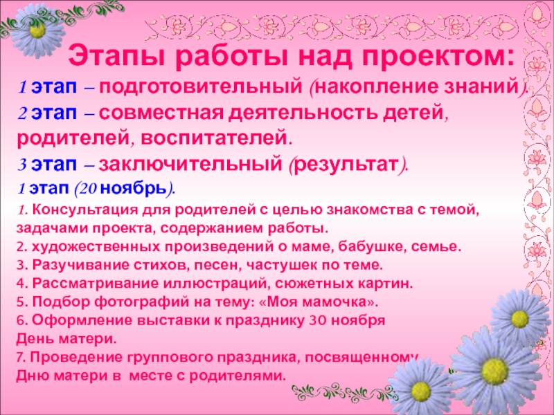 1. Консультация для родителей с целью знакомства с темой, задачами проекта, содержанием работы.