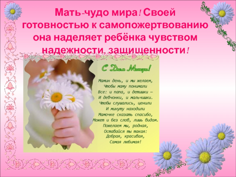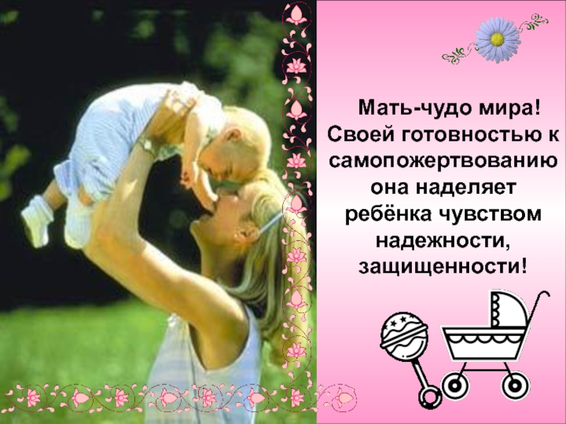 Слайд 23Мать-чудо мира! Своей готовностью к самопожертвованию она наделяет ребёнка чувством надежности,