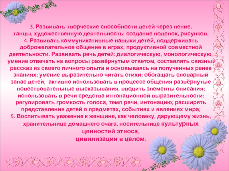 5. Воспитывать уважение к женщине, как человеку, дарующему жизнь, хранительнице домашнего очага, носительнице культурных ценностей этноса,
