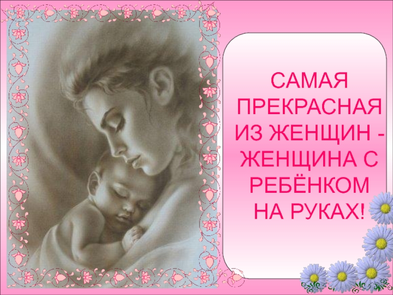 Слайд 3САМАЯ ПРЕКРАСНАЯ ИЗ ЖЕНЩИН - ЖЕНЩИНА С РЕБЁНКОМ НА РУКАХ!