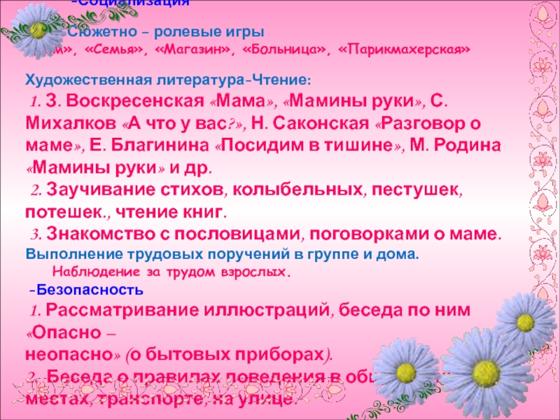 1. З. Воскресенская «Мама», «Мамины руки», С. Михалков «А что у вас?», Н. Саконская «Разговор о маме», Е. Благинина «Посидим в тишине», М. Родина «Мамины руки» и др.