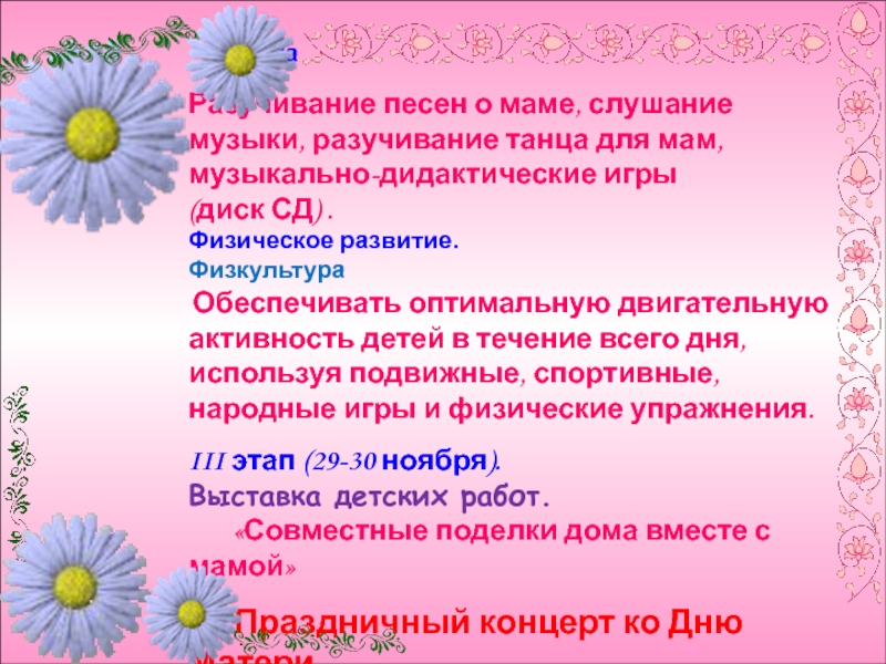 Разучивание песен о маме, слушание музыки, разучивание танца для