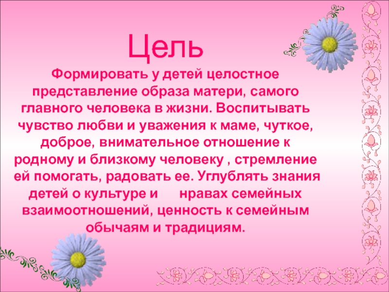 Формировать у детей целостное представление образа матери, самого главного человека в