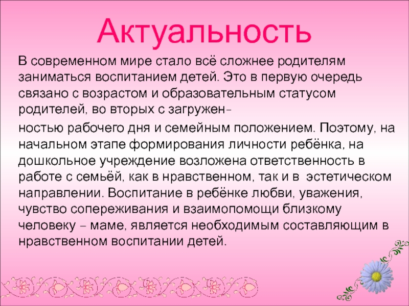 ностью рабочего дня и семейным положением. Поэтому, на начальном этапе формирования личности ребёнка, на дошкольное учреждение возложена ответственность в работе с семьёй, как в нравственном, так и в эстетическом направлении. Воспитание в ребёнке любви, уважения, чувство сопереживания и взаимопомощи близкому человеку – маме, является необходимым составляющим в нравственном воспитании детей.