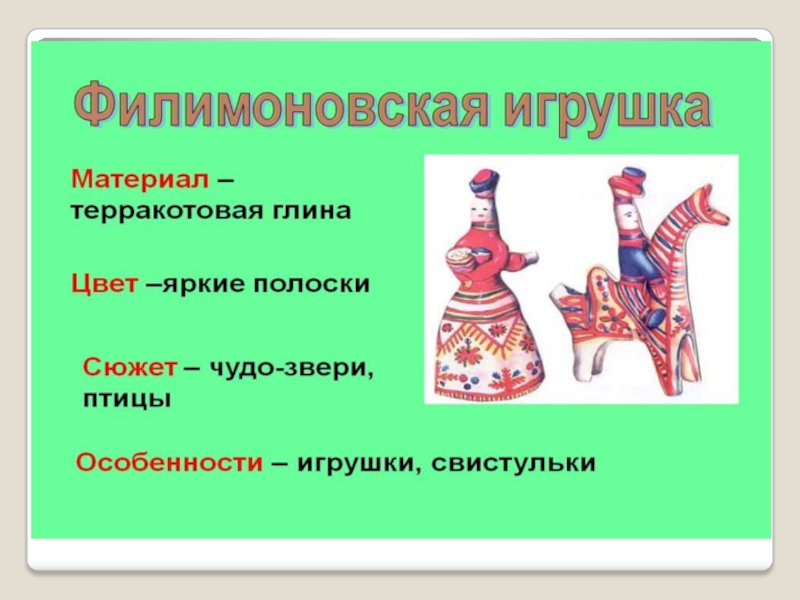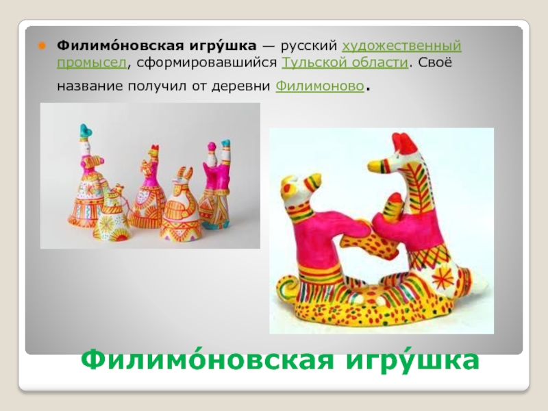 Филимо́новская игру́шкаФилимо́новская игру́шка — русский художественный промысел, сформировавшийся Тульской области. Своё название получил от деревни Филимоново.