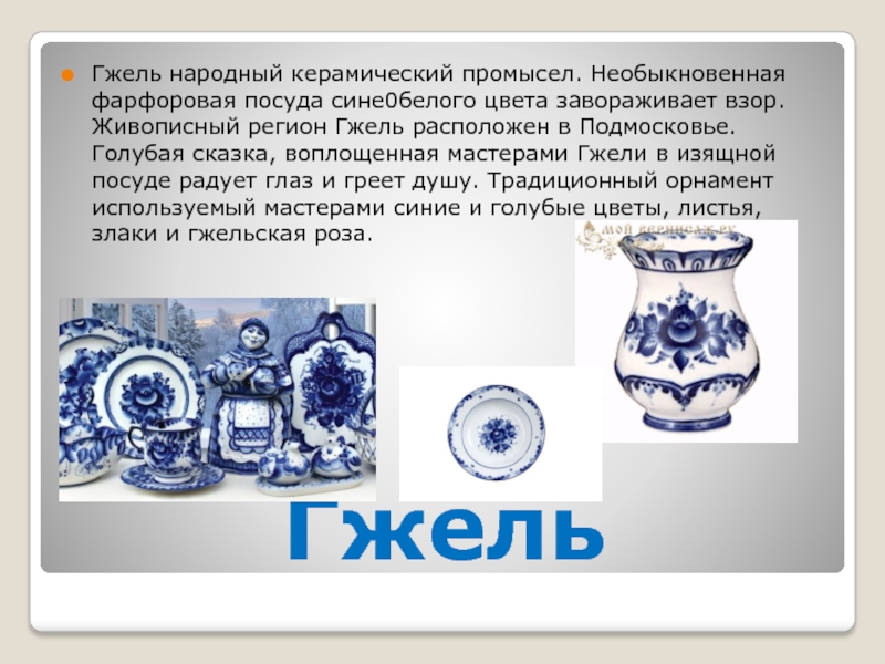 ГжельГжель народный керамический промысел. Необыкновенная фарфоровая посуда сине0белого цвета завораживает взор. Живописный регион Гжель расположен в Подмосковье.