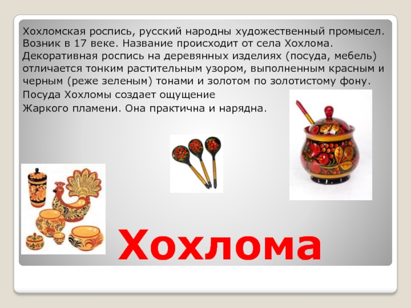 ХохломаХохломская роспись, русский народны художественный промысел. Возник в 17 веке. Название происходит от села Хохлома. Декоративная