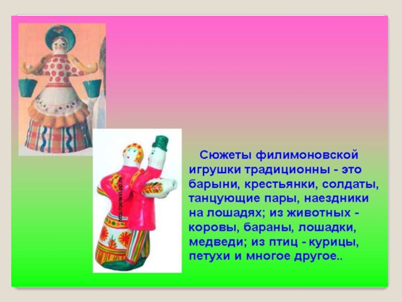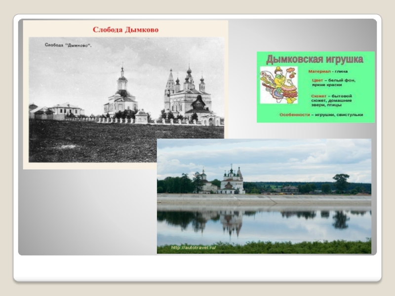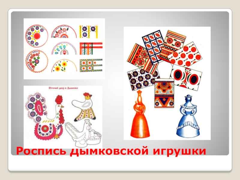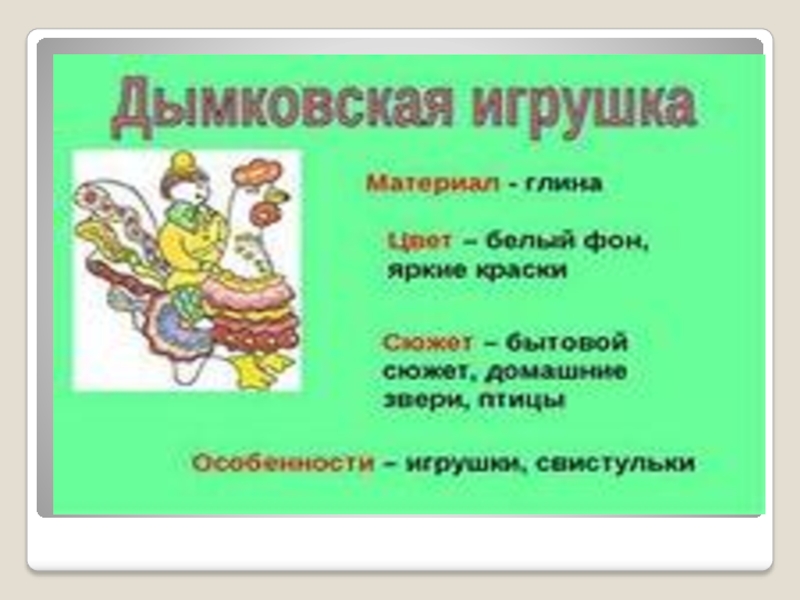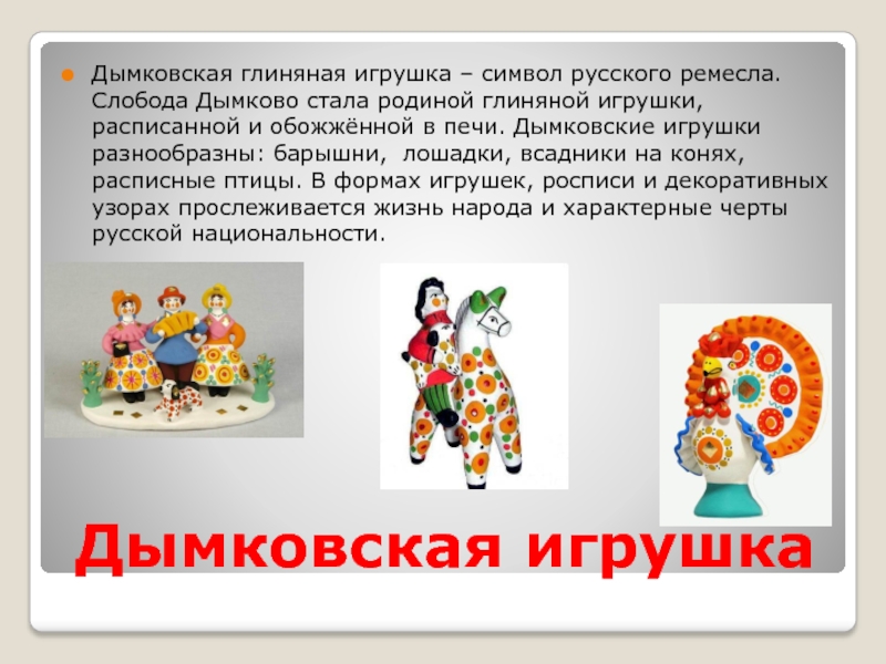 Дымковская игрушкаДымковская глиняная игрушка – символ русского ремесла. Слобода Дымково стала родиной глиняной игрушки, расписанной и обожжённой