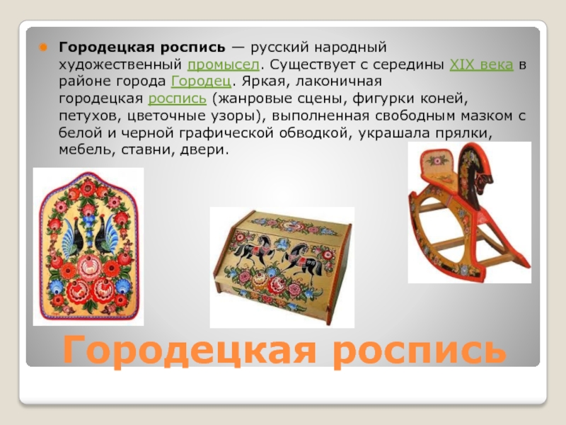 Городецкая росписьГородецкая роспись — русский народный художественный промысел. Существует с середины XIX века в районе города Городец. Яркая, лаконичная городецкая роспись (жанровые сцены, фигурки коней,