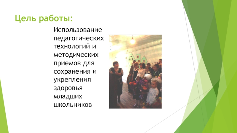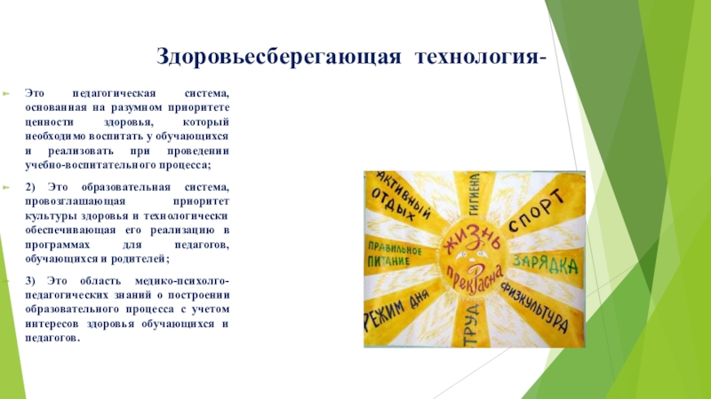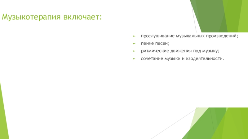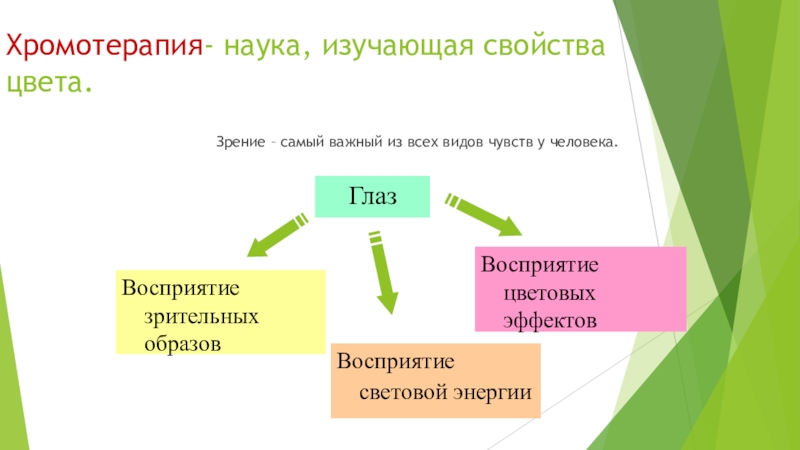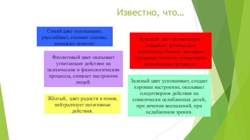 Зеленый цвет успокаивает, создает хорошее настроение, оказывает плодотворное действие на соматически ослабленных детей, при лечении воспалений, при ослабленном зрении.